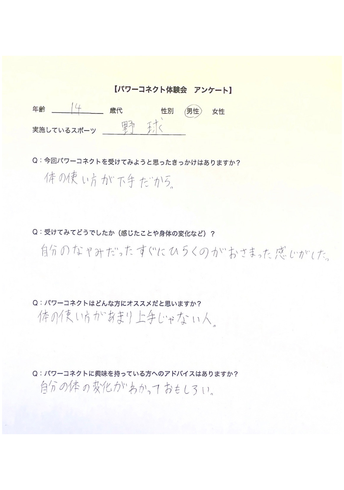 バッティングで悩みだった体のひらきがおさまった。自分の体の変化がわかって面白い。