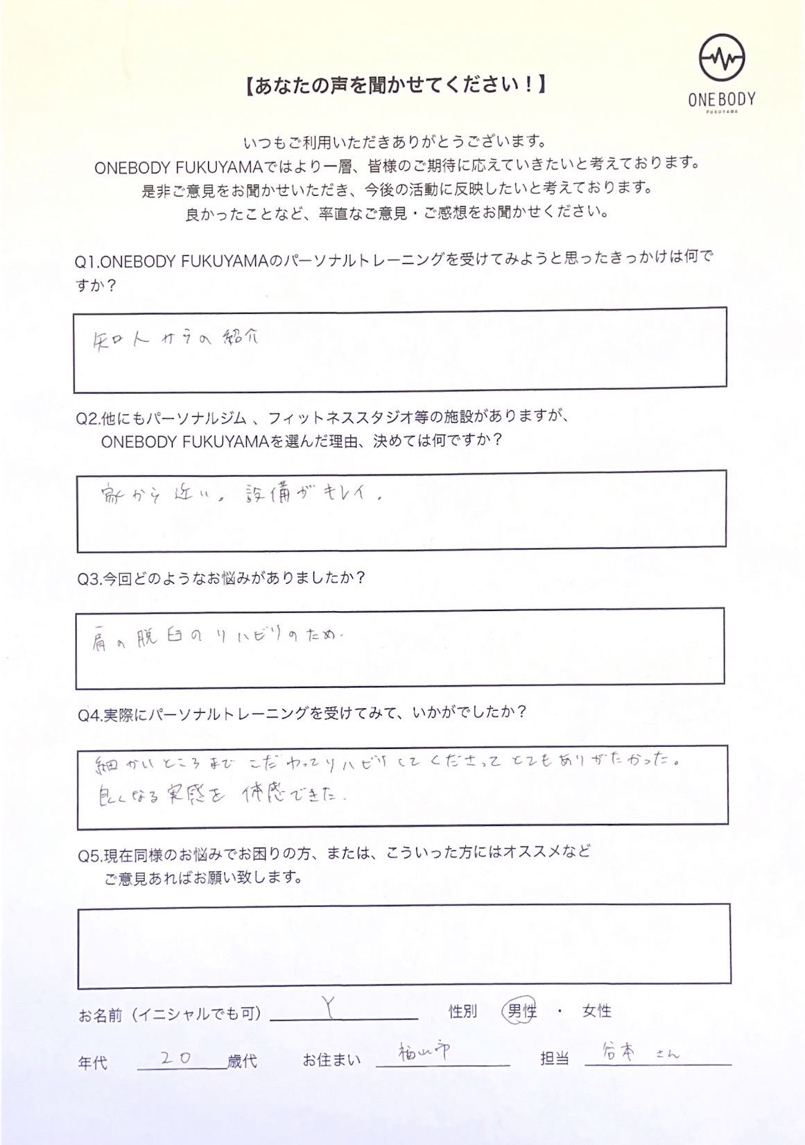 肩の脱臼のリハビリのため知人の紹介で行った。細かいところまでこだわってしていただき良くなる実感を体感できた。